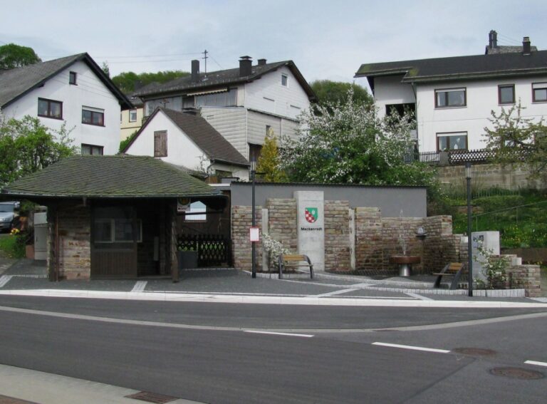 Der Dorfmittelpunkt unseres Ortes ist der neu angelegte Brunnen neben der Bushaltestelle. Eingerahmt von einer schön versetzten Bruchsteinmauer mit Ortswappen und dem Foto der ehemaligen Edelsteinkönigin Rebecca Mildenberger, erstrahlt er abends in wunderschönen Farben. Zwei Bänke bieten Besuchern einen angenehmen Sitzplatz zum Verweilen. Schon in früheren Zeiten wurde hier allabendlich von den Dorfbewohnern der Tag mit einem Schwätzchen beendet.