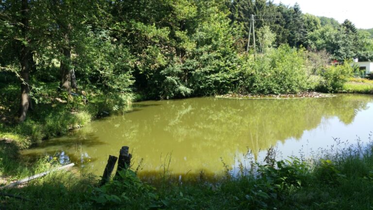 Eingebettet in eine gepflegte Grünanlage, befindet sich am oberen Ortsausgang der kleine Dorfweiher. Angelegt wurde dieser in früheren Zeiten als Brandteich für die Feuerwehr. Zweiseitig von hohen Laubbäumen eingerahmt spiegeln sich deren Blätter in der glänzenden Wasseroberfläche. Am hinteren Ende erfreut ein Teppich aus leuchtenden Wasserrosen den Besucher, während das Schilfrohr am rechten Ufer Fröschen Schutz für ihren Laich bietet.