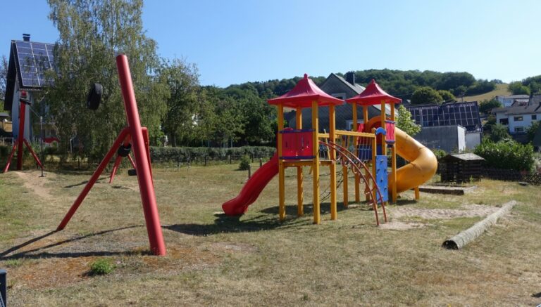Unweit des Dorfmittelpunktes befindet sich der Kinderspielplatz. Auf dem groß angelegten Areal, das von einem niedrigen Zaun umzäunt ist, befinden sich schön angelegt, mehrere bunte Spielgeräte. Hauptaugenmerk ist der große Kletterturm mit zwei Rutschen – einer geraden roten und einer gelben gewundenen Röhrenrutsche. Verbunden werden diese mit einer Hängebrücke. Hinauf kommt man entweder über eine Leiter, als auch über ein Kletternetz oder eine Kletterwand. Eine weitere gern genutzte Attraktion ist die lange Seilbahn, mit der man rasant von einem zum anderen Ende schwingt. Ein waagerechter, frei schwingender Reifen, der an einer stabilen Kette hängt, wird gerne als Karussellersatz benutzt, da dieser auch um sich selbst drehbar ist. Eine waagerechte Stange bietet kleinen Turnern/innen die Möglichkeit ihr Geschick und ihre Kraft zu testen. Eine normale und eine Babyschaukel dürfen natürlich auf keinem Spielplatz fehlen. Der Sandkasten, der Balancebalken und ein kleines Häuschen bieten den kleinsten Kindern weitere Spielmöglichkeiten. Für die beaufsichtigenden Eltern stehen Sitzmöglichkeiten zur Verfügung.