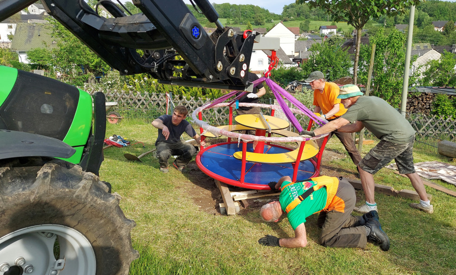 Als neuestes Spielgerät wurde am Montag, 22.05.23 von Mitgliedern des Gemeinderates ein Karussell aufgestellt und die Verankerung einbetoniert.